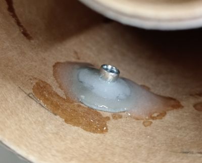 So habe ich dann die Einschlagmutter eingebaut und mit einer Schraube so festgezogen, dass sie in die Knete gedrückt wird, aber ohne dass das Gewinde der Schraube verklebt wird. An meinem Teststück hält das allein schon irre fest. In der Flamingo werde ich noch einen Klecks Epoxy über das ganze geben.