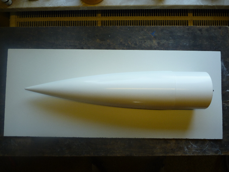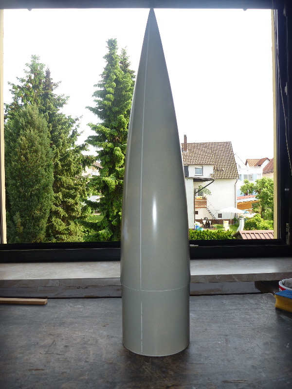 Dem Datenverlust nach dem Serverausfall ist leider auch mein aktueller Bericht zum Opfer gefallen. Da ich die Bilder noch vorbereitet und sortiert habe, werde ich den Bericht wieder rekonstruieren. Hallo Raketenfreunde! Hier folgt mein neuer Baubericht einer A4 im Maßstab etwa 1:10. Bisher habe ich 2 A4-Modelle gebaut. Eines für D-Motoren und eins für G- und H-Motoren. Ich finde das Design der A4 einfach prima und will sie daher nun noch mal ein Stück größer bauen. Das Projekt wird kein richtiger Scalebau. So verzichte ich z.B. auf äußerliche Details. Auch werden die Flossen nicht, wie beim Original, über das Heck ragen (beim Original sind hier die Strahlruder angebracht). Meine Vorgaben für den Bau: - Komplett GFK (Hüllenteile) - Formenbau (Spitze und Heckkonus werden aus einer GFK-Form gemacht) - 2-stufige Bergung - gute Flugstabilität - sauberes Finish Hier ein erster Entwurf in Rocksim: