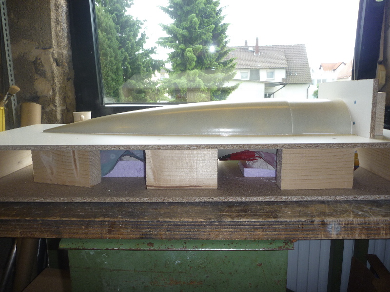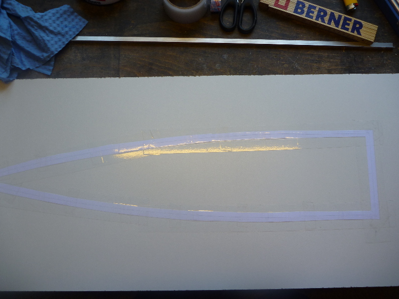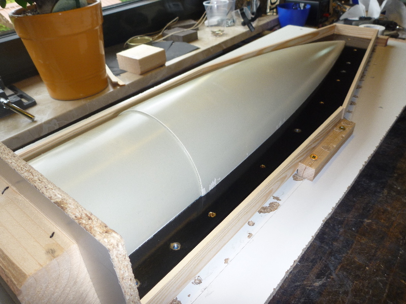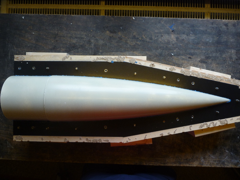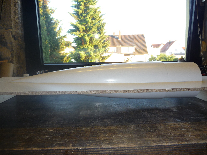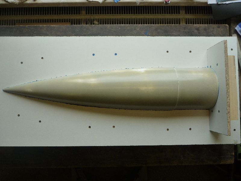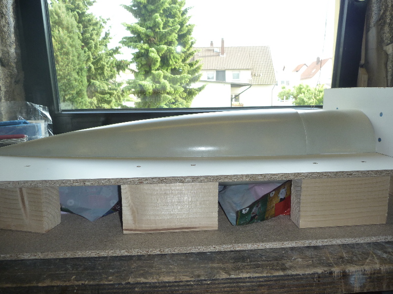 Der Formenbau: Die Spitze und das Heck der A4 sollen aus einer GFK-Form gemacht werden. Los gehts also mit der Herstellung der Form. Als Urmodell dient eine 6"-GFK-Spitze von PML. Die Trennebene der Form besteht aus einer 10mm starken, beschichteten Preßspanplatte: Die Kontur des Urmodells muss nun auf auf die Trennplatte übertragen werden. Die muss ich hier nicht vom Urmodell selbst abnehmen, sondern nutze den Rocksim-Ausdruck, was die ganze Sache natürlich vereinfacht: Danach wird die Kontur ausgesägt und bearbeitet bis das Urmodell in das Trennbrett passt: Damit sich später beim Hantieren mit der Form nichts verschieben oder verwinden kann, wird ein steifer Rahmen gebaut. Ohne diesen Unterbau würde das Trennbrett auch leicht durchhängen und keine saubere Trennebene bilden:  Nun wird das Urmodell vorbereitet. Hier erst mal Spritzspachtel aufgebracht: