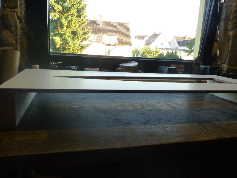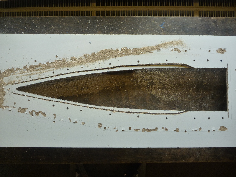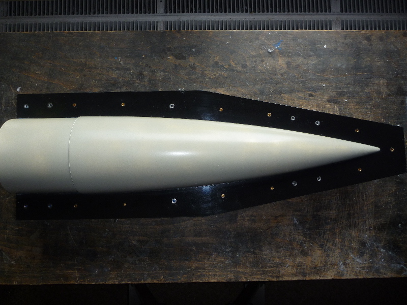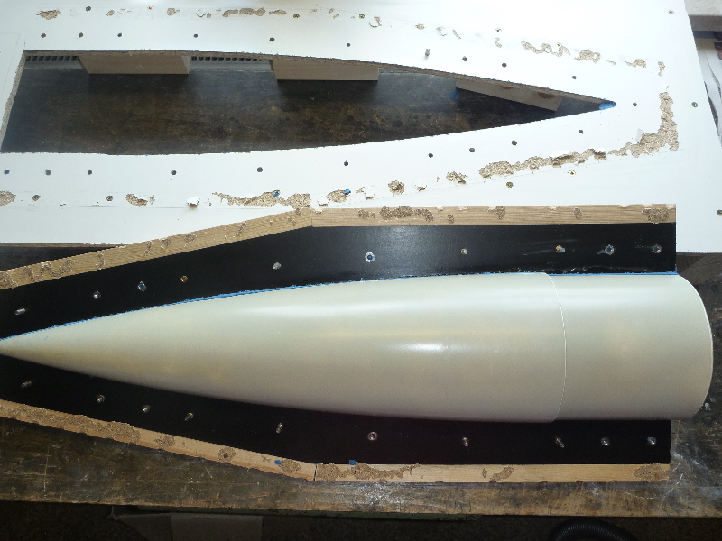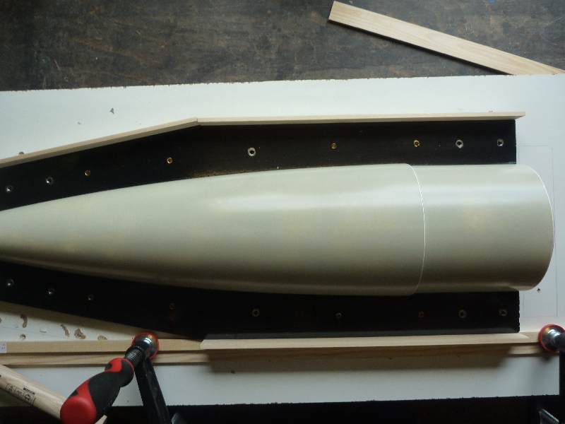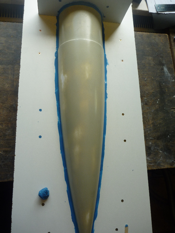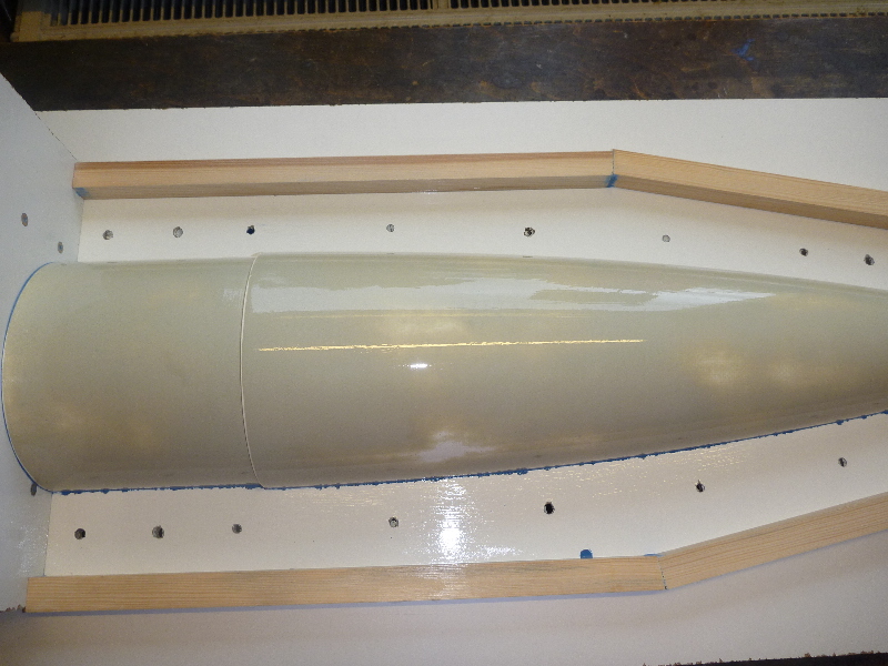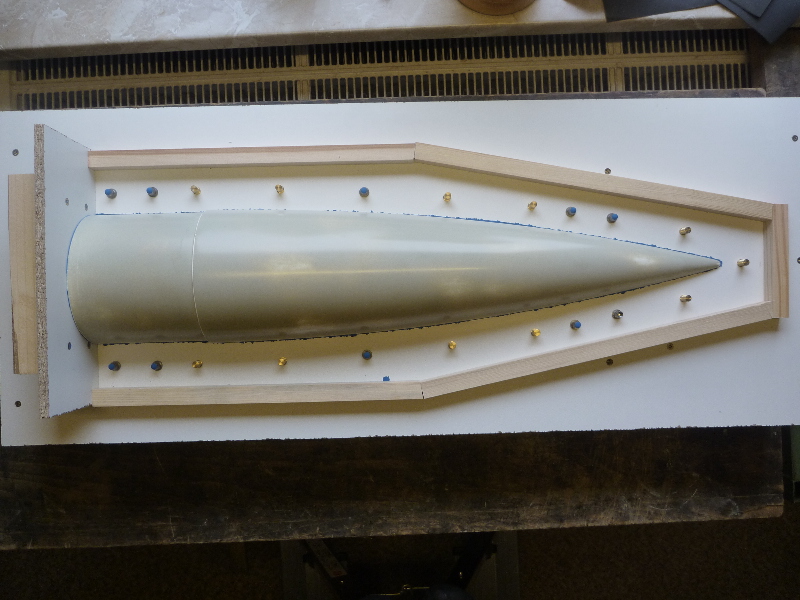 Der Formenbau: Die Spitze und das Heck der A4 sollen aus einer GFK-Form gemacht werden. Los gehts also mit der Herstellung der Form. Als Urmodell dient eine 6"-GFK-Spitze von PML. Die Trennebene der Form besteht aus einer 10mm starken, beschichteten Preßspanplatte: Die Kontur des Urmodells muss nun auf auf die Trennplatte übertragen werden. Die muss ich hier nicht vom Urmodell selbst abnehmen, sondern nutze den Rocksim-Ausdruck, was die ganze Sache natürlich vereinfacht: Danach wird die Kontur ausgesägt und bearbeitet bis das Urmodell in das Trennbrett passt: Damit sich später beim Hantieren mit der Form nichts verschieben oder verwinden kann, wird ein steifer Rahmen gebaut. Ohne diesen Unterbau würde das Trennbrett auch leicht durchhängen und keine saubere Trennebene bilden:  Nun wird das Urmodell vorbereitet. Hier erst mal Spritzspachtel aufgebracht: