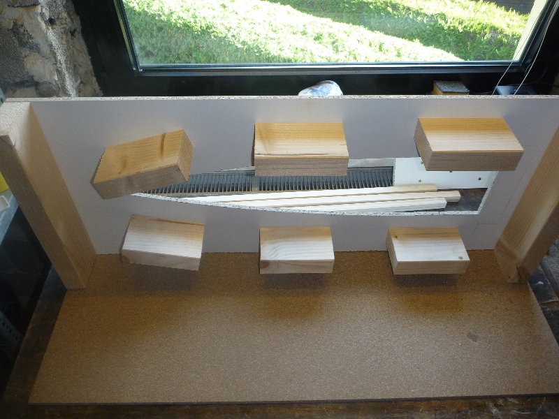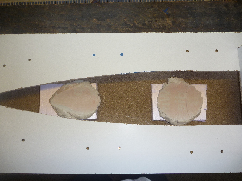 Das Urmodell muss für die späteren Laminierarbeiten sicher im Trennbrett sitzen. Dazu braucht es eine definierte Auflage. Dazu werden Styrodurplatten auf die Grundplatte geklebt (Superkleber) um die Distanz zu verringern: Die eigentliche Auflage bilden dann Klumpen aus Töpferton, in die das Urmodell beim Einlassen ins Trennbrett gedrückt wird (Plastikfolie dazwischen!). Nach 24h ist der Ton hart (getrocknet) und das Urmodell sicher verankert. Hier in den Bildern ist mein erster Versuch mit Gips zu sehen. Das hat leider nicht so gut geklappt, da der Gips doch recht schnell abbindet und mir die Zeit zum genauen Ausrichten nicht reichte.