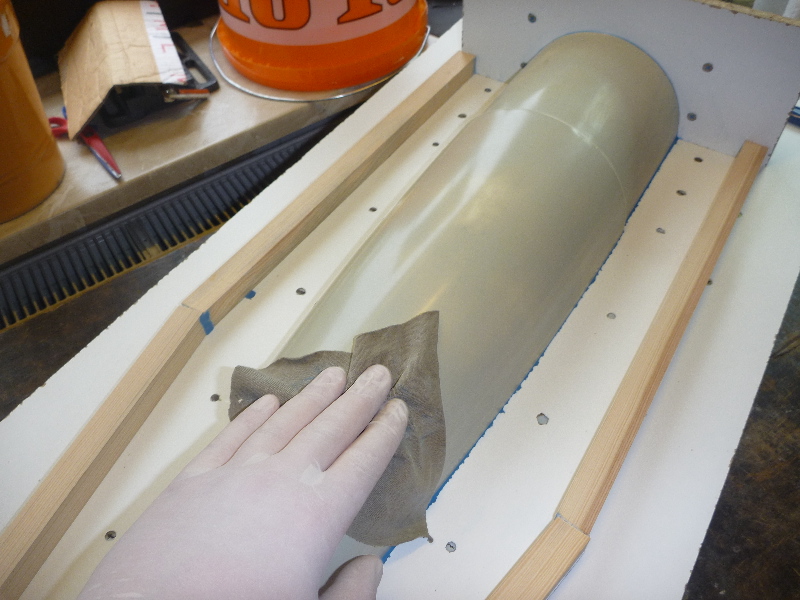 Der Aufbau für die erste Formhälfte ist damit soweit fertig. Bevor es mit dem Laminieren los gehen kann, ist aber noch ein wichtiger Schritt nötig. Die Urform muss eingetrennt werden. Erstmal wird dazu alles mit Waschbenzin gereinigt. Nach gutem Ablüften werden dann 5 Schichten Grundierwachs aufgetragen. Jede Schicht muss gut ablüften, und wird dosiert poliert bevor die nächste drauf kommt. Als letzte Trennschicht wird das Folientrennmittel PVA aufgepinselt. Die vorhergehenden Wachsschichten sorgen hierbei nicht nur als Trennschicht, sondern auch dafür das der PVA sich gleichmäßig verteilt.