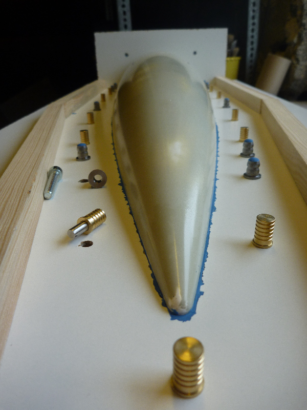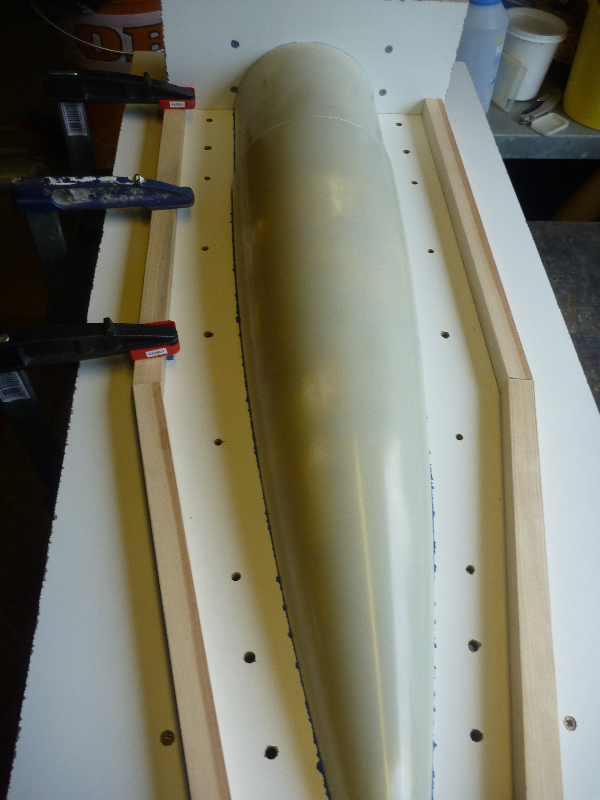 Zur Begrenzung des Formenrands werden Leisten auf das Trennbrett geklebt. Bohrungen für die Formverschraubungen und Paßstifte sind auch schon eingebracht: Hier werden dann die Verschraubungen und Stifte durch ihre Schrauben bzw. Zapfen gehalten und können sich so beim Laminieren nicht verschieben: