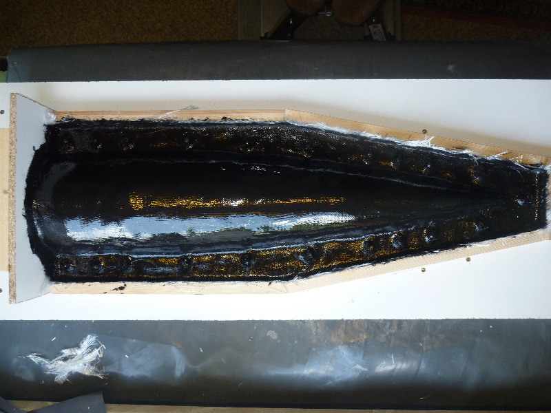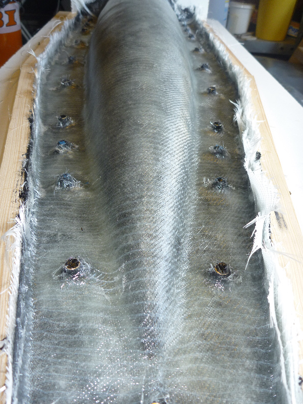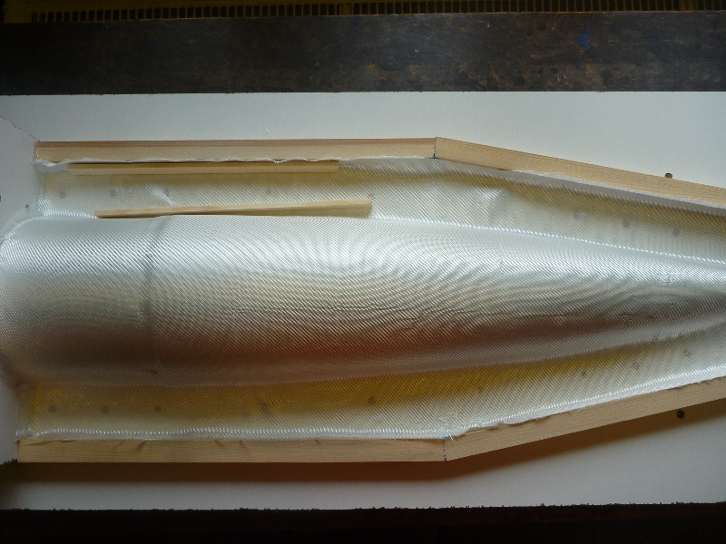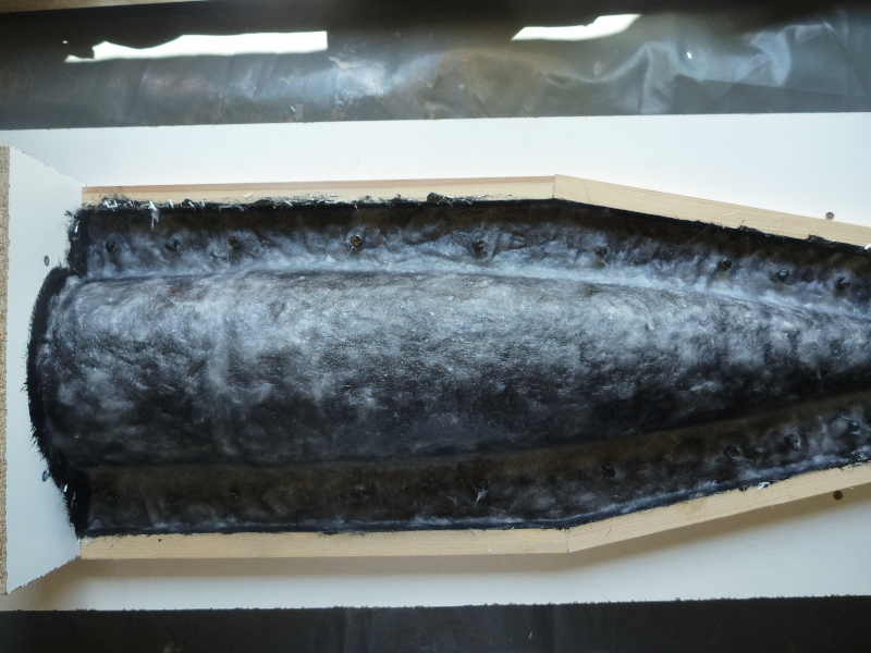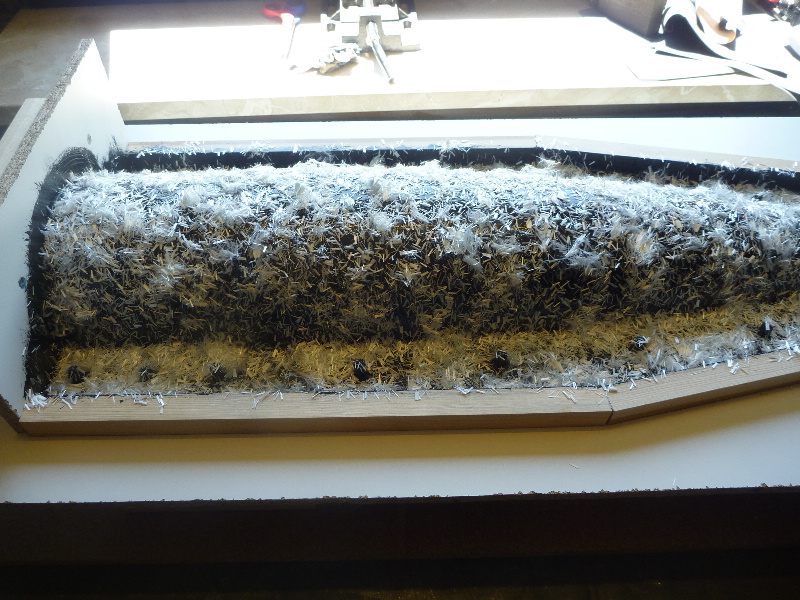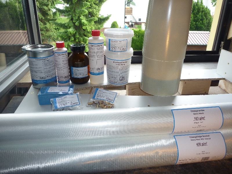 Vor dem Eintrennen sind die Glasgewebe zurecht geschnitten worden: Jetzt gehts los: Als Deckschicht das Formenharz: Danach werden die Glasfaserschnitzel aufgestreut. Die sorgen für eine gute mechanische Verbindung zwischen Deckschicht und dem nachfolgenden Laminataufbau (geteert und gefedert). Jetzt heißt es erstmal ein bisschen abwarten: Nach ca. 1,5h (Sommertag, 30°C in der Werkstatt) ist das Formenharz gut angeliert. Es zieht keine Fäden mehr, ist aber noch sehr klebrig. Die überschüssigen Glasfaserschnitzel werden jetzt vorsichtig abgesaugt: Dann wird die Kupplungsschicht aus einem Harz-Glasschnitzel-Baumwollflocken-Gemisch aufgetragen. Diese Schicht rundet die steilen Kanten der Form, damit das Glasgewebe faltenfrei laminiert werden kann: Dann kommen die Glasgewebe drauf. Der Aufbau erfolgt Lagen-Symetrisch: Erst einmal 163g/m² Glas. Dann zweimal 430g/m² Glas. Noch einmal 163g/m² Glas.... ....und zuletzt noch mal Formenharz:
