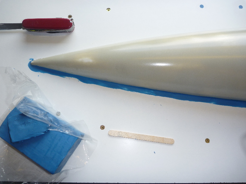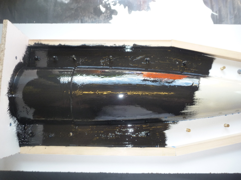 Das Urmodell wird dann geschliffen und klar lackiert. Die Oberflächengüte des Urmodells bestimmt natürlich die Güte des späteren Modells. Je mehr Arbeit hier investiert wird, desto weniger Nachbearbeitung ist später am Modell erforderlich: Hier mal die Auflistung der Materialien die ich zum Formenbau benutzt habe: - Laminierharz L mit Härter L (nicht im Bild) - Formenharz P mit Härter EPH 161 - Grundierwachs - Folientrennmittel PVA - Glasfaserschnitzel (4mm) und Baumwollflocken - Modelliermasse - Formverschraubungen und Paßstifte - Glasgewebe 163g/m² - Glasgewebe 430g/m²