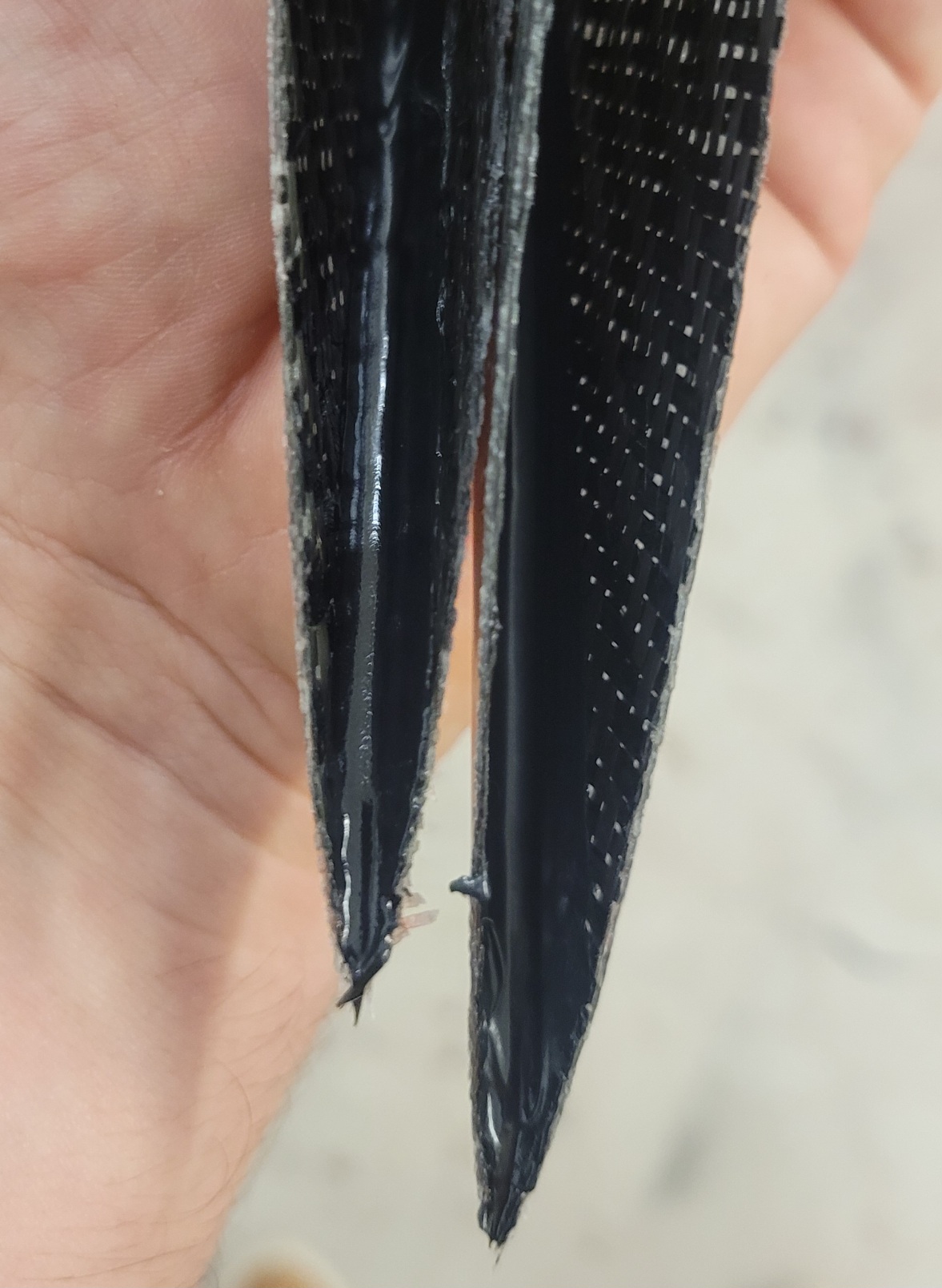 Deswegen habe ich z.B. auch die Flossen neu laminiert, denn das Ausschäumen mit Epoxidschaum wurde zu schwer. Also einmal neu und diesmal nicht nur Glas sondern auch Kohle! Außen haben sie eine Lage 220g/m² Glas bekommen, gefolgt von eineinhalb Lagen 200g/m² Carbon, wobei die halbe Lage die untere Hälfte der Flosse abdeckt. Dort sieht die Flosse eh am meisten Last und ist durch den verrundeten Übergang zum Rumpf gut angebunden.