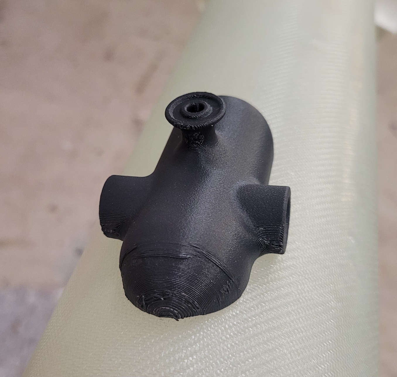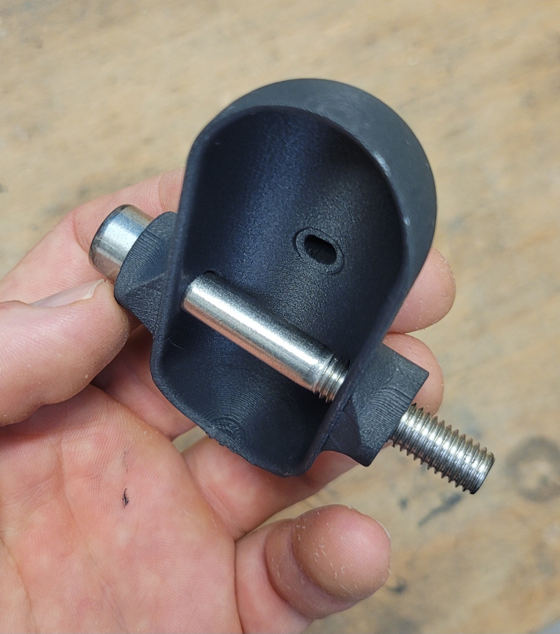 Das einzige was für den Rumpf noch fehlt ist eine Befestigung für die Schokleine. Die kommt zwischen Innen- und Außenrohr unter und ist über eine Aussparung im Innenrohr zugänglich, gleichzeitig kommt hier ein Gewinde für ein Railbutton rein. Auch hier 3D-Druck: