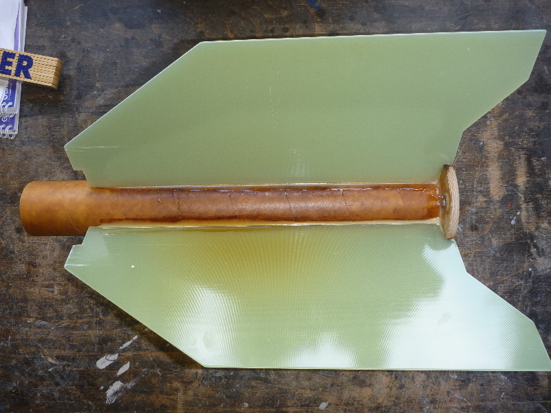 Die letzte Flosse kann auf das Motorrohr geklebt werden: Soweit das Heck. Jetzt steht an die Verbindung der Flossen zum Motorrohr weiter zu verstärken und Feilen/Scheifen bis alles schön passt... Viele Grüße Dennis