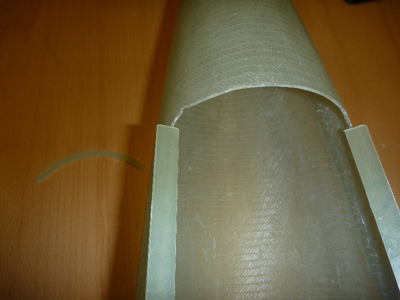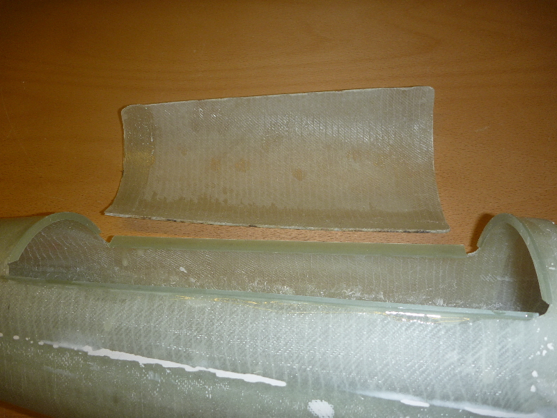 Die Klappe für den Hauptfallschirm hab ich mit dem Dremel per Hand rausgeschnitten. Ziemlich schief und krumm ist der Ausschnitt daher, und das Spaltmaß viel zu groß. Damit die Klappe später auch schön passt, habe ich auf die Kanten des Ausschnitts GFK-Leisten geklebt. So kann dann die Klappe genau angepasst werden: