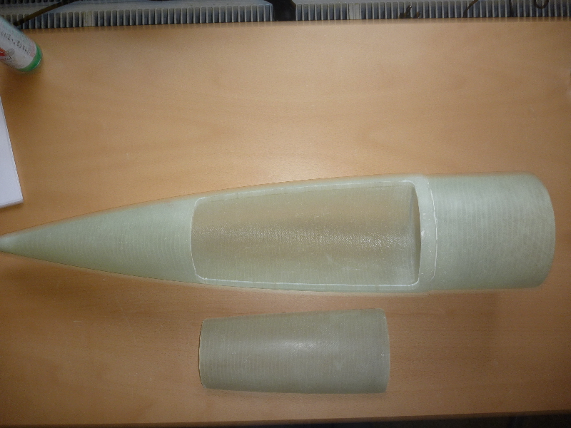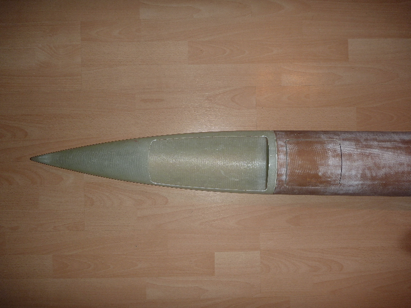 Zwischen Motorrohr und Leitwerk sind Fillets eingebracht, und zur Verstärkung mit 160g Glas laminiert. Endlich gehts mal wieder weiter! Im Augenblick grüble ich über Möglichkeiten einen Klappenmechnismus zu realisieren. Ausserdem möchte ich die noch notwendigen Komponenten (Hauptfallschirmkammer, Elektronik ect.) möglichst weit oben unterbringen. Desto geringer wird das zusätzlich nötige Ausgleichgewicht in der Spitze.