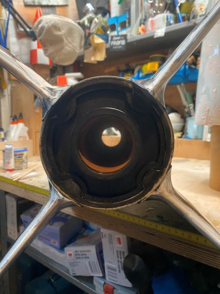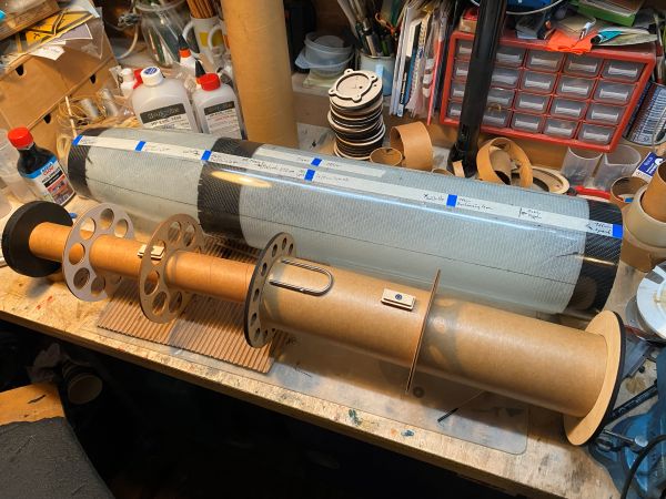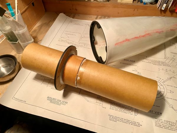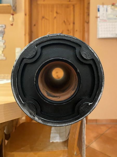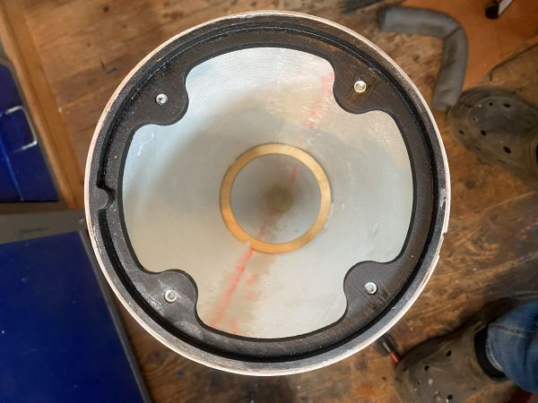 ich hätte schon weiter sein können, aber ich habe den ersten Tag meines Urlaubs genutzt, um meine Werkstatt gründlich aufzuräumen. Ich habe tatsächlich wieder so etwas wie reichlich Platz auf meiner Werkbank..... Ein absolutes Highlight unter den Umständen weiter zu basteln und zu kleben! Und ich kann vermelden, alle Ringe, Spanten, Innenrohre, Gewindemuffen, Haltebügel und sonstiges Gedöns hat seinen Platz gefunden. Ziemlich praktisch an einem 4" Innenrohr ist, das wenn man das Innenleben von unten nach oben aufbaut, man bis zuletzt fast überall noch jederzeit mit der Hand rankommt. Ganz schön heftiges Teil mittlerweile. Die Spitze hat einen 2x 6mm Haltering mit vier Stück M4 Gewindemuffen eingesetzt bekommen, der trägt später mal das Innenrohr (Kupplerrohr) mit E-Bay Weiter vorne / oben in der Spitze sitzt ein Zentrierring, der das Innenrohr führt um seitliche Belastungen (Kippen) an der Schraubverbindung zu vermeiden. Auf dem Innenrohr sitzt das Gegenstück zum Haltering. Links ist der Kuppler, rechts der Teil der in die Spitze ragt. Dort, soweit oben wie möglich (auf dem Bild ganz rechts) wird später die E-Bay mit dem Haltepunkt und dem Release für den Fallschirm sitzen. Der E-Bay Einsatz wird sich später von oben auf dem Rohr abstützen und um mit dem Zug die schmale Klebefläche des Passrings nicht auf Scherung zu belasten, habe ich darüber einen amtlichen Stützring aus 4" Rohr verklebt. Das ändert zwar nichts an der Belastungsrichtung, aber erhöht die Klebefläche um ein vielfaches. So kann das Rohr definitiv nicht durch den Ring gezogen werden. Soweit Geändert von Kabelmann am 21. Dezember 2025 um 21:40 |
