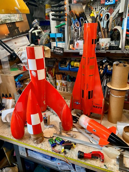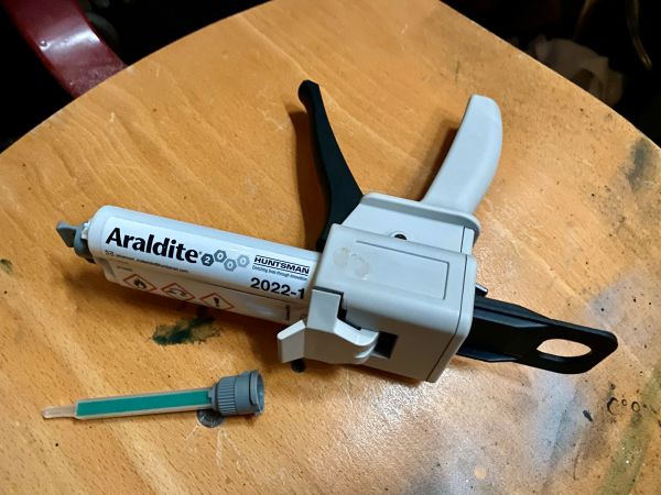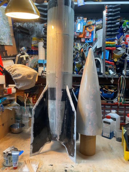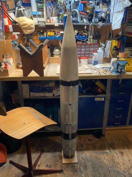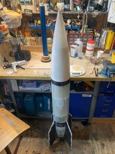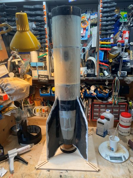 Ich bin etwas voran gekommen mit der A4 und so möchte ich Euch den aktuellen Zustand nicht vorenthalten. Finnen und Körperrohr kommen zusammen stand auf dem Plan. Und zwar so, wie vom Erbauer der Form und von Roman erfolgreich verifiziert, an das Körperrohr angeklebt..... Nun ist "Finnen einfach ankleben" ja eher etwas aus dem Low-Power Bereich, und harmoniert keinesfalls mit der geplanten Motorisierung im J-Bereich, aber ich vertraue da mal ganz Romans Erfahrung und betrete da (für mich) mal komplettes Neuland. Romans Empfehlung bezieht sich dabei auf die Wahl eines geeigneten Klebers. In meiner Welt hätte ich die Finnen mit angedickter Epoxi/Glasballonmatsche angeklebt, und aus meiner Erfahrung heraus sind die Nähte und Fillets so starr, das sie bei der erstbesten seitlichen Belastung dann einfach abbrechen oder aufbrechen. Die "erstbeste seitliche Belastung" bei einer Rakete mit dermaßen nach hinten überstehenden Finnen wäre dann auch gleich die erste Landung Heck-voran am Fallschirm hängend. Wie das immer so ist, fällt das Geraffel ja nicht in die Wiese, sondern trifft den steinharten Fahrweg neben der Wiese. Meine 4" TinTin Rakete und die 3" Jayhawk (obwohl bei weitem nicht so groß) können da ein Lied von singen. Alle vier Finnen wurden sauber entgratet, der Schaum passend runtergeschliffen und die Klebeflächen amtlich angeraut, sofern nicht durch das Abreissgewebe schon rau genug. Die Empfehlung lautete, ein langsamer oder mittelschneller, zähelastisch aushärtender Kleber auf Epoxyd-Basis. Im Raum standen da zB 3M ScotchWeld DP490 oder Araldite 20irgendwas von Huntsman. Das 3M Zeug kostet in der 50ml Doppelkartusche um 40€, gehts noch? Das Araldite-Zeug war mit 23€ wesentlich günstiger und so wurden zwei Kartuschen angeschafft, inkl. Dosierpistole und einem Dutzend Mischdüsen zum Einmalgebrauch. Für den Klebevorgang kam das präparierte Bodenbrett und der 3D gedruckte Ausrichtefuchs zum Einsatz. Ich bin restlos begeistert. Zum Einen natürlich vom Ergebnis, zum Anderen von dem Klebezeug. Sauber zu applizieren, langsam genug um sauber und überlegt zu handeln, schnell genug, um 30 Minuten später mit der nächsten Finne weiterzumachen. Überhaupt kein Vergleich zu 5 Minuten Epoxi. Außerdem absolut bombenfest, aber spürbar flexibel. Ohne mir weitere Gedanken zu machen würde ich da (wie geplant) guten Gewissens einen mittleren J-Motor reinstecken. So begeistert übrigens, das die Wracks der TinTin und der Jayhawk auch gleich noch ein paar Klebenähte verpasst bekommen haben. Das verspricht eine endlose Lackiererei zu werden, wenn hier alles fertig ist, was ich auf dem Tisch habe. Aber ich schweife ab, zurück zur A4. Ab jetzt ist zweifelsohne zu erkennen, was es werden soll. Das kann sich doch sehen lassen!? |