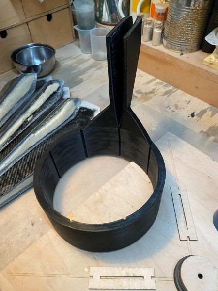 Die Finnen kommen an das Körperrohr und spätestens ab da ist es (die) eine Rakete. Allerdings sind das ja nun nicht irgendwelche flachen Sperrholzfinnen sondern plastische, gewölbte, dreidimensionale, räumliche Hohlkörper oder Formteile oder wie auch immer. Ich will sagen, das Bedarf etwas Vorbereitung. Roman hat zu diesem Zweck eine Lehre konstruiert, die die Finne ausrichtet und fixiert, und diese auf dem 3D Drucker realisiert. Und, er war so nett, mir die Druckdatei zukommen zu lassen. Danke dafür, das Teil ist eine große Hilfe. Nun hab ich mit 3D Druck mal so gar nichts am Hut, aber, wir haben so ein Ding in der Firma stehen!! Also hab ich ganz offiziell bei uns in der F&E vorgesprochen, wurde trotz Begeisterung für die Sache an sich und Begreifens der Dringlichkeit der Sache und des höheren Zweckes, ganz förmlich an die Chefin verwiesen und dort hieß es 7€ (Filament) in die Kaffeekasse oder ein Blech Kuchen für alle. Hab mich für den Kuchen entschieden, und meine Tochter war so nett, die Kollegen mit einer 1A Donauwelle zu beglücken. Das sei hier der Vollständigkeit halber mal erwähnt. Danke Johanna!! Und Schwuppdiwupp hatte ich so ein 1A und einwandfrei 3D gedrucktes Flossenausrichtelehreplastikdingsbums. Als Verbesserungsvorschlag wäre hier eine kleine Kerbe oben auf dem Ring zu nennen, fluchtend mit der Halterung der Finne, um das ganze besser an der Filzstiftlinie auf dem Körperrohr auszurichten. Und der Innendurchmesser ist möglicherweise etwas knapp.... Als weitere Ausrichtehilfe habe ich eine massive Holzplatte auf dem Laser graviert: - ein Kreuz aus einer Doppellinie - exakt in der Mitte eine Bohrung für einen M5 Gewindeeinsatz - gravierte Ringe zum Ausrichten des Rear Closures eines 54mm Motorgehäuses. Auf den exakt mittig verschraubten Verschluss lässt sich dann das Motorgehäuse aufschrauben. Auf den senkrecht und fest stehenden Motor lässt sich der vorbereitete Raketenkörper spielfrei aufsetzen und durch verschiedene Unterlegscheiben aus Sperrholz auf die passende Höhe bringen, da die Finnen ja über das hintere Ende hinausragen. Soweit die Vorbereitungen. Geändert von Kabelmann am 21. Dezember 2025 um 22:40 |