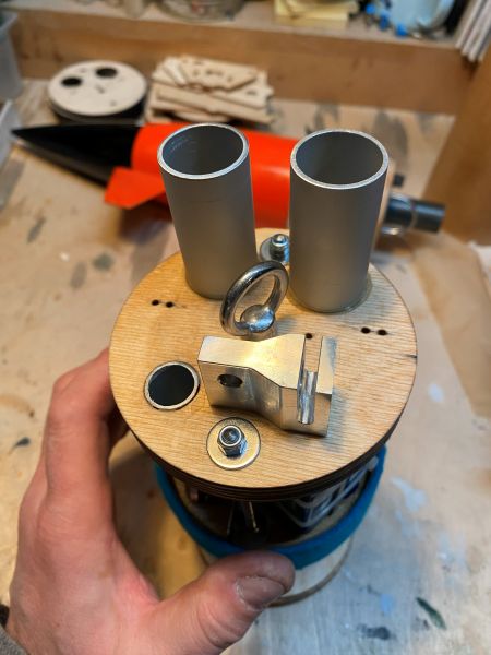 Die Elektroniken (Altimax und Altimax Simply) und andere unerhebliche Kleinigkeiten fehlen noch, aber das Grundgerüst ist fertig, Funktionell habe ich mich da stark an der E-Bay meiner 3" Harpoon orientiert, diese hat bei vielen schönen Flügen immer zuverlässig ihren Dienst getan. Wenn nicht gleich, so sind die Bedingungen dort zumindest ähnlich: - Position in der Spitze - Eigengewicht ist zugleich Trimmgewicht - Serielle zweistufige Bergung Das ganze wird von oben in das Kupplerrohr in der Spitze eingesetzt und stützt sich auf dem oberen Rand ab. Das untere Abteil (im Bild rechts) bietet Platz für den RC Schlepphaken und das (nicht gerade kleine) Servo um diesen zu betätigen, sowie für die beiden 3S LiPo Akkus. Das obere Abteil enthält die Montageplatte für die beiden barometrischen Höhenmesser. Dieses Abteil ist durch Löcher im oberen Bulkhead mit dem Umgebungsdruck innerhalb der Spitze verbunden. An geeigneter Stelle wird die Spitze drei kleine Ventilationsöffnungen nach außerhalb der Hülle haben. Außerhalb, "auf dem Dach" der EBay werden zwei Magnetschalter Platz finden, um die Elektroniken von außerhalb der Raketenhülle mit einem Dauermagneten einzuschalten. Der mittlere Bulkhead dient als gas- und druckdichte Trennung zwischen den beiden Abteilen. Hier sitzt ein 2,5cm Ring aus Phenolrohr der mit Filz beklebt ist. Eine unauffälligere Farbe gabs leider nicht, dafür war der Filz kostenlos. Geschenktem Gaul..... Die Dichtung ist so eng toleriert, das sich die ganze EBay nur mit erheblicher Kraft in das Kupplerrohr schieben lässt. Diese Konstruktion hat schon in der Harpoon die Höhenmesser zuverlässig vor dem Druckstoß der Ausstoßladungen auf der anderen Seite geschützt. Bin tatsächlich am Überlegen, auf seitliche Verschraubungen im Kupplerrohr zu verzichten. Schauen wir mal. Rechtzeitig vor Weihnachten kam auch Bäckchens Paket mit dem gefrästen Pyrorelease an, welches ebenfalls noch auf dem Bergespant Platz brauchte. An dieser Stelle noch einmal vielen lieben Dank dafür, Bäckchen. Die kleinen Löcher sind für die Zuleitungen der Klemmen für die Zünder der drei Ausstoßladungen. Die beiden Behälter werden die Austoßladungen für die Trennung am Gipfelpunkt beinhalten. Ein Behälter Main-Elektronik (Altimax), ein Behälter Backup-Elektronik (Simply). Es wird einen Packsack (Deploymentbag) für den Hauptschirm geben, der an einem Ring hängt, durch den eine dünne Seilschlaufe läuft, welche auf der einen Seite durch den Servohaken und auf der anderen Seite durch den Bolzen im Pyrorelease gehalten wird. Freigabe erfolgt entweder über das Öffnen des servobetätigten Schlepphakens (Altimax) oder durch Freigabe durch Zünden des Pyrorelease (Simply). Das jeweils freie Ende der Seilschlaufe läuft durch den Ring und der Deployment Bag ist frei. Soweit der Plan. So dürfte ich über ein vollständig redundantes, serielles Bergesystem verfügen. Geändert von Kabelmann am 06. Januar 2026 um 18:47 |