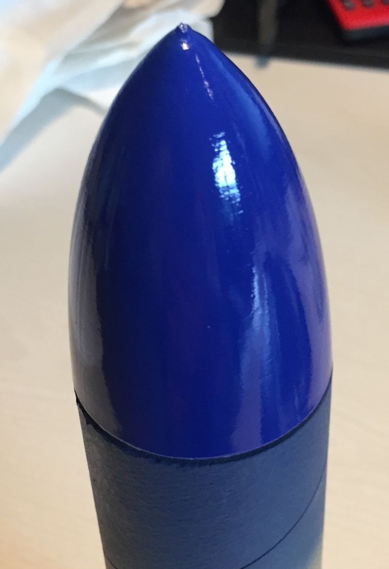 Die Spitze war heute morgen fertig, ich habe sie mit 0,8mm Wandstärke gedruckt, das sind genau zwei Bahnen, ohne dass der Drucker da Füllmaterial zwischenlegen muss, das geht dann schneller. Sie ist so gebaut, dass ich unten ein Stück Kuppler einstecken kann, dadurch passt es dann auch genau in das Körperrohr. Zwei Verstärkungsringe sind mit eingedruckt um die Stabilität etwas zu erhöhen, und die oberen 10 mm der Spitze sind massiv. An der Stelle der Ringe wölbte sich die Oberfläche ein bisschen, das war aber nach dem Abschleifen weg. Insgesamt eine sehr praktikable Methode passende Spitzen herzustellen, jede beliebige Form ist möglich.